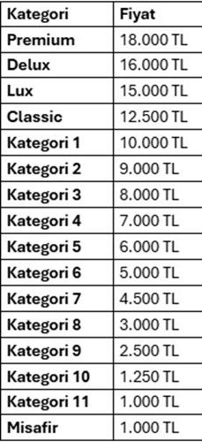 1. Tüm kategoriler yemeksizdir. İsteyen taraftarlarımız ekstra ücret ödeyerek yiyecek-içecek satın alabilirler.